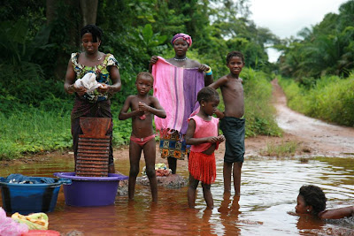 Uma das atracções da Floresta de Cantanhez é a vida selvagem, infelizmente cada vez se encontram menos animais. Conseguimos ver macacos. Não os das gaiolas mas daqueles em que andamos com um guia pelo meio da selva até os começarmos a ouvir e depois os ver saltar de árvore em árvore mesmo por cima de nós. Passámos por aldeias perdidas no meio do nada com crianças por todo o lado e como podem ver em alguma fotografia, na mesma água onde se toma banho, lava-se a roupa e a loiça..jpg)